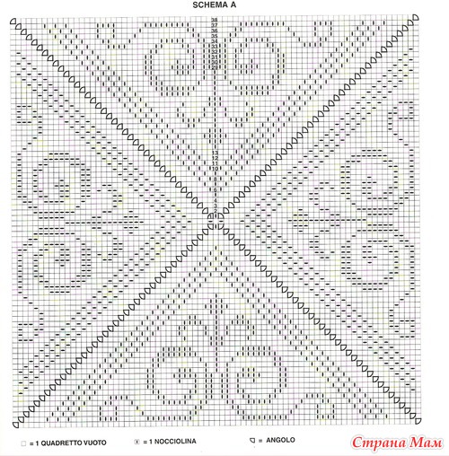 1 quadretto vuoto - 1 квадратик пустой (1столбик с накидом, 2 воздушные петли, 1 столбик с накидом)