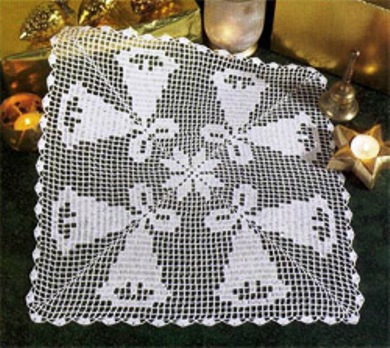 Эта симпатичная салфетка выполнена филейным вязанием по кругу. Пустая клетка: 1 столбик с накидом и 2 воздушные петли (ст. с/н, 2 в.п., ст. с/н, 2 в.п. и т.д.), заполненная клетка: 3 столбика с накидом (так принято указывать в описаниях, хотя на самом деле в заполненной клетке 4 столбика). Угловые элементы: 1 столбик с накидом, 3 воздушные петли, 1 столбик с накидом в ту же петлю основания.