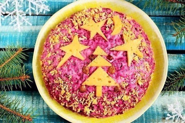 Отличительная особенность этого новогоднего салата — это индивидуальная подача. Так блюдо воспринимается совсем иначе.