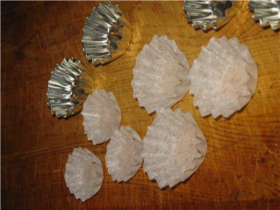Нам понадобятся рифленые метал.формочки;бумага для выпечки или пергамент...,то есть такая бумага,которая при намокании не разваливается;карандаш,ножницы и чашка с водой.