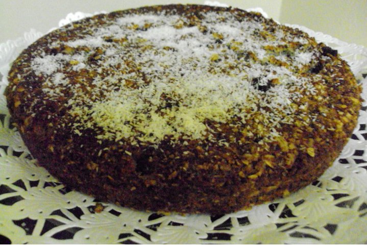 Форму смазать раст.маслом и посыпать овсяными хлопьями.Выложить тесто и разровнять лопаточкой. Выпекать в разогретой духовке 45 минут при 180 гр С. Готовый кекс выложить на блюдо и присыпать кокосовой стружкой.
