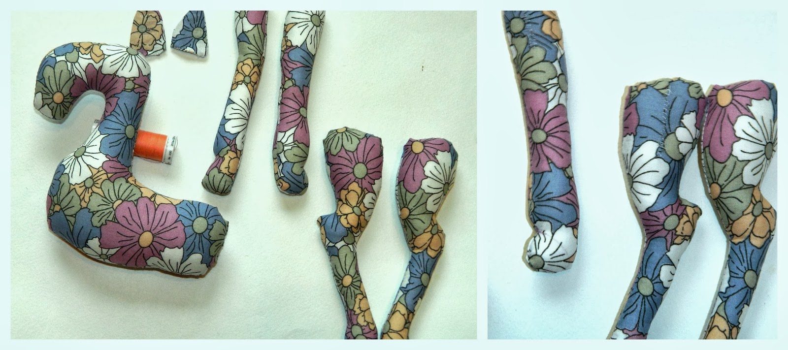 Вырезаем выкройку и, дальше по налаженной схеме, наносим рисунок на ткань, прошиваем на машинке по контуру, оставляя место для выворачивания.