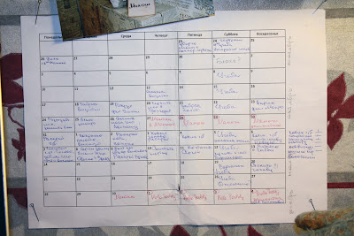 Нам с вами нужен план, чтобы видеть весь объём предстоящей работы. У меня есть ежедневник, где месяц расчерчен по неделям, там я ставлю себе задачи на неделю. Так же на стене у меня распечатан календарик, в который я записываю каждодневные дела. В ежедневнике он более подробный, а здесь всё сжато и наглядно, чтобы хватило одного брошенного взора для ясности в голове.