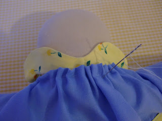 7. Так как у куклы голова немного плоская, вовнутрь чепчика в края я закладываю синтепон, чтобы чепчик лучше держал форму.