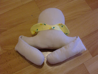 теперь мы будем собирать нашу верхнюю часть пакетницы. Пришиваем голову и ручки к туловищу, прошиваем пальчики. Кружочек для носика собираем по краю на нитку, стягиваем, внутри шарик синтепона. Приклеиваем, или пришиваем на положенное ему место.