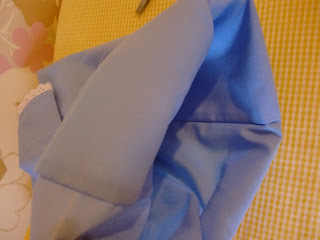 2. Переворачиваем ткань на изнанку и пристрачиваем к раю изделия (2-3 мм. от края) кружево. Попутно делая на кружеве мелкие складочки, чтобы кружево "легло" на закругленный срез.