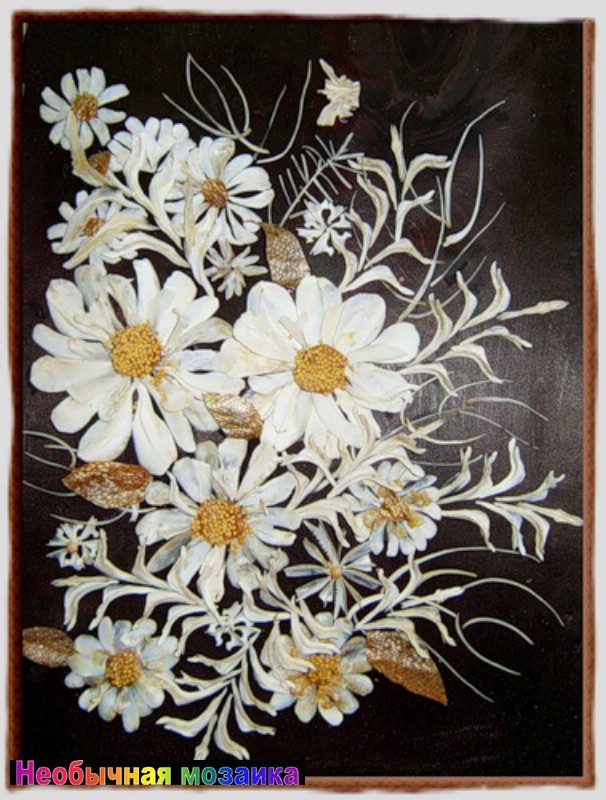 Крупная чешуя карповых рыб используется для плоской инкрустации и мозаичного выклеивания, выкладки декоративных цветов, для оклеивания снежного пейзажа в макетах. Выкладку узоров из твердой чешуи выполняют по предварительно созданному рисунку на пластической массе или мастике. Изделие либо покрывается мастикой, либо целиком изготовляется из пластической массы. Рецептов для изготовления пластмассы много. |