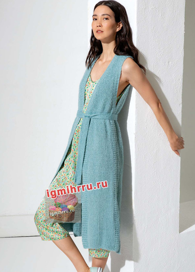 ДЛИННЫЙ ХЛОПКОВЫЙ ЖИЛЕТ С ПОЯСОМ. ВЯЗАНИЕ СПИЦАМИ |