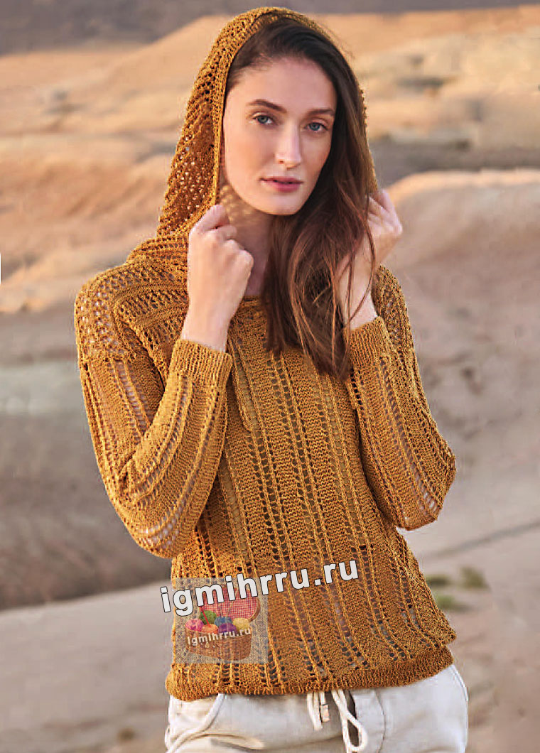 ПУЛОВЕР С КАПЮШОНОМ И СКВОЗНЫМИ УЗОРАМИ. ВЯЗАНИЕ СПИЦАМИ |