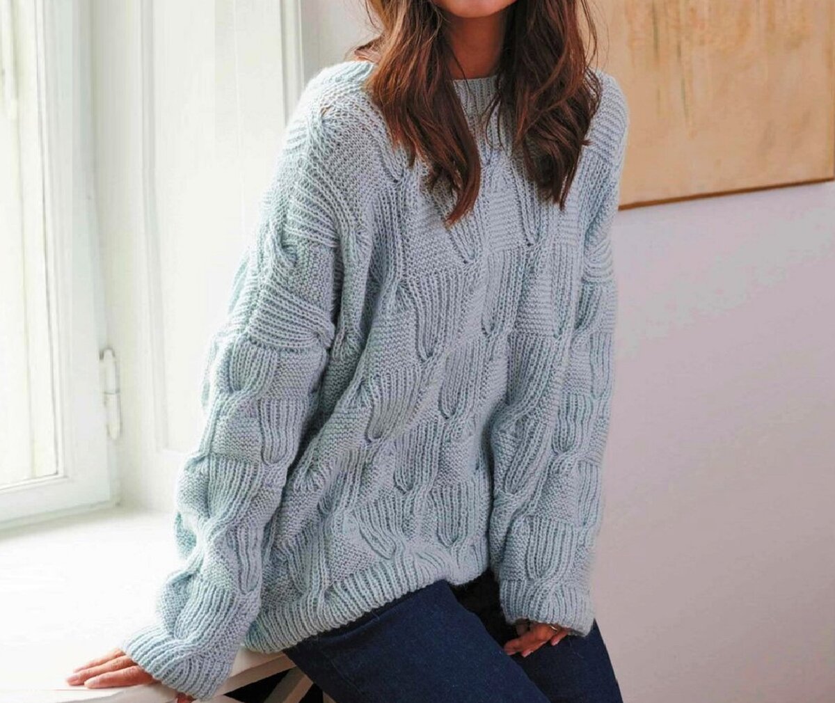 Чтобы связать такой очаровательный пуловер, предлагаем воспользоваться описанием джемпера бледно-голубого цвета, приведённым ниже. Необходимо только изменить вырез горловины.
