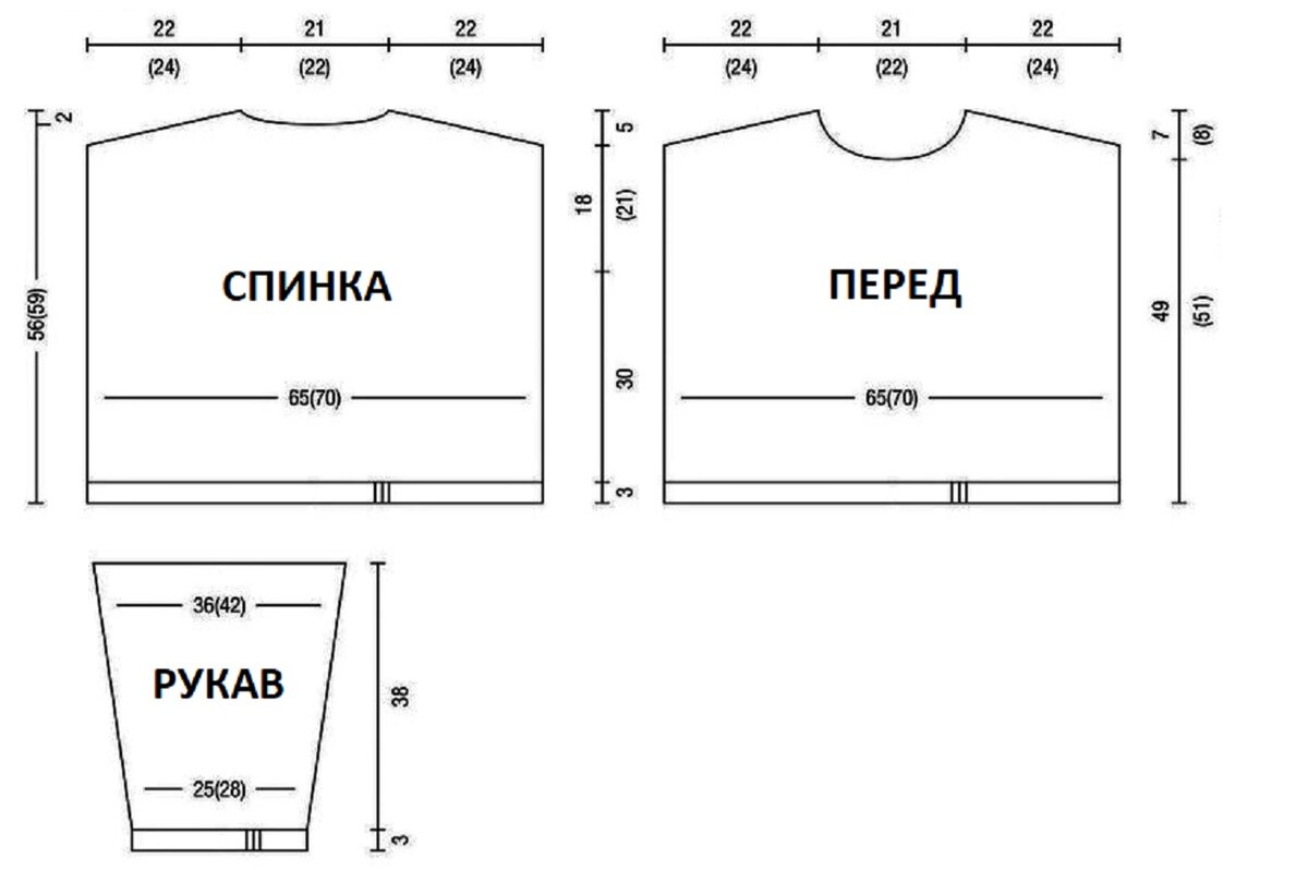 Ширина пуловера по обхвату груди: 130 (140) см.