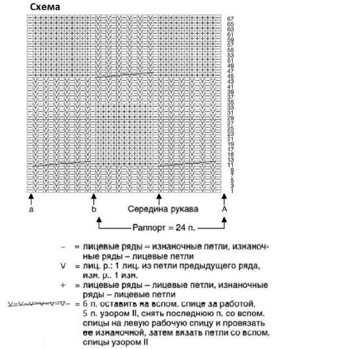 На схеме показаны лицевые ряды, в изнаночных рядах петли вязать по рисунку, если не указано иначе.
