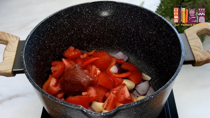 Готовим соус. На небольшом количестве растительного масла обжариваем нарезанный репчатый красный лук и болгарский перец. Добавляем чеснок целиком, 5-6 долек, резаные помидоры, острый перец по желанию.