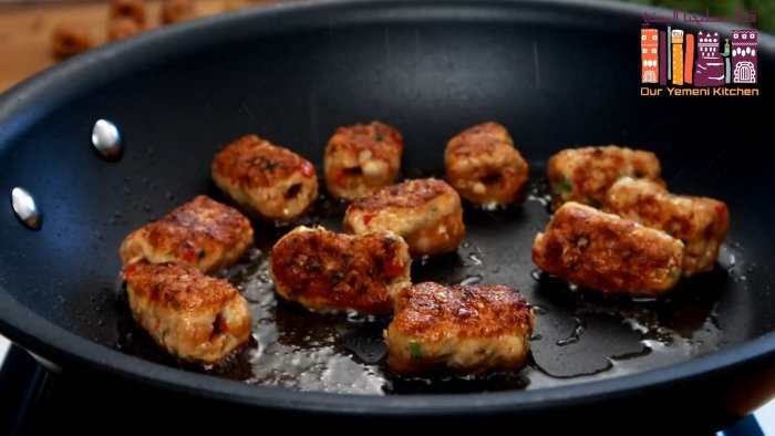 Разогреваем сковороду и добавляем небольшое количество растительного масла. Выкладываем кусочки фарша и обжариваем со всех сторон на среднем огне, переворачивая по мере готовности.