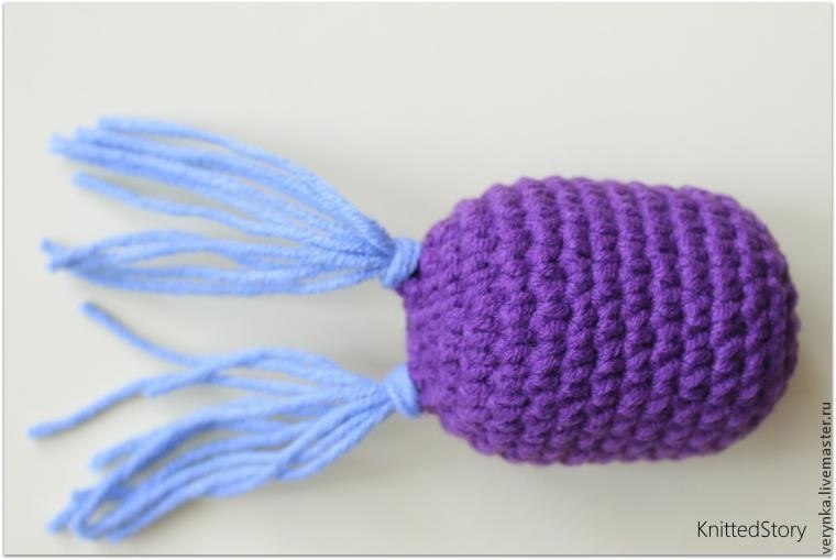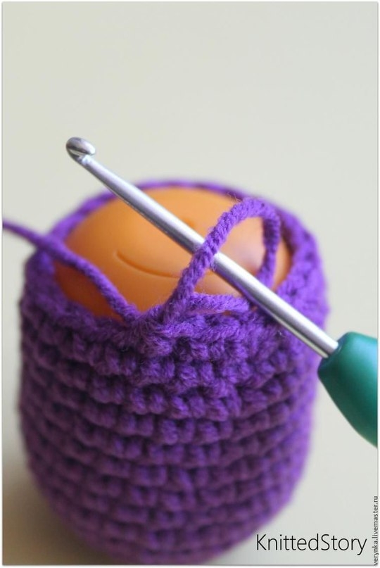 Но вяжем пока отдельно от него, вставим мы его окончательно позже, я обязательно укажу когда именно. Вяжем ровно по 24 сбн до необходимой высоты. У меня это получилось 10 рядов. Затем вставляем яйцо вовнутрь нашего вязания.