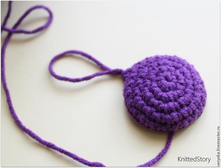 Теперь начинаем вязать. Берем крючок и нитку фиолетового цвета, набираем 2 воздушные петли, во вторую от крючка петлю провязываем 6 столбиков без накида.