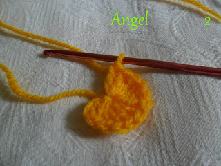 2-й круговой р.: в каждую арку из возд. п. 1-го кругового р. связать 1 ст. б/н, 1 полуст., 3 ст. с/н, 1 полуст. и 1 ст. б/н, заканчивать 1 соед. ст. в соед. ст. 1-го кругового р.; 3-й круговой р.: пройти вперёд, связав за работой 2 возд. п., между 2 ст. б/н 1-го кругового р. связать 1 ст. б/н в кольцо, * 4 возд. п., 1 ст. б/н между следующими обоими ст. б/н 1-го кругового р. в кольцо, повторить от * еще 3 раза, 4 возд. п., заканчивать 1 соед. ст. 8 1-й ст. б/н (= 5 арок из возд. п.); 4-й круговой р.: в каждую арку из возд. п. 3-го кругового р. связать 1 ст. б/н, 1 полуст., 2 ст. с/н, 3 ст. с/2н, 2 ст. с/н, 1 полуст. и 1 ст. б/н, заканчивать 1 соед. ст. в 1-й ст. б/н.