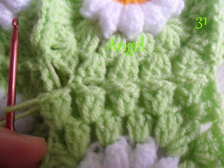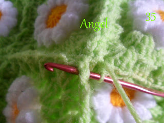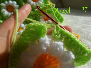 Свяжите маленькие мотивы по схеме F - по 6 шт. на одну пройму (= 12 шт.), по 3 шт. на одну полочку (= 6 шт.), в последнем ряду присоединяя к уже существующим мотивам. Всего 18 шт.