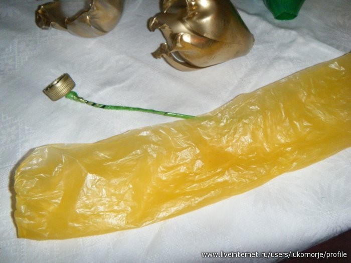 Проволоку и крышечку обкручиваем "нитками" из полиэтиленового мешка зеленого цвета, переодически подклеивая, прижимая пальцами, предварительно подержав над свечкой. Свечку выбирайте некоптящую