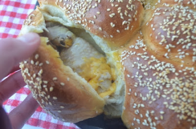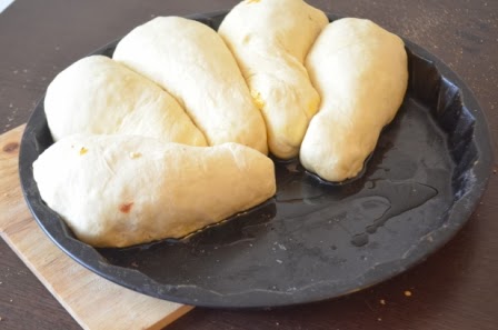 Смазать кисточкой желтком с молоком, посыпать кунжутом и отправить в духовку на 1 час при 180 гр. Я выпекала на середине духовки. Если начнет сильно румяниться - прикрыть фольгой в 2 слоя.
