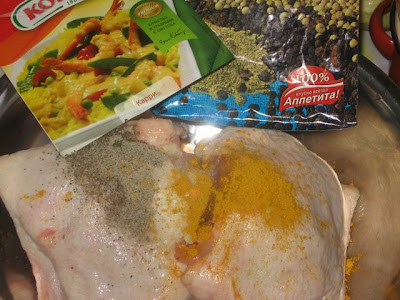 Окорочка вымыть, обмазать солью и приправами. Солить чуть-чуть.