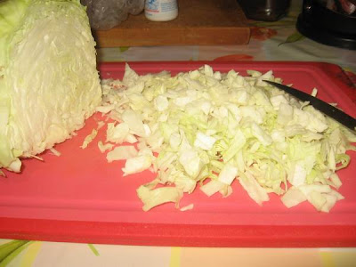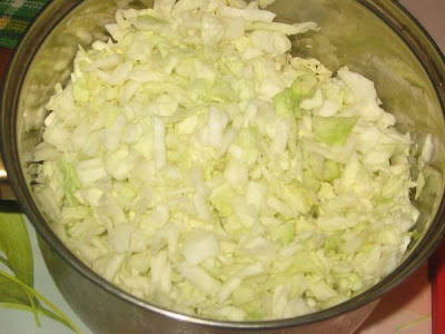 Пока тесто подходит, занимаемся приготовлением начинки. Капусту режем произвольно, но не крупно.