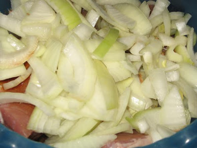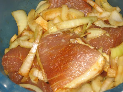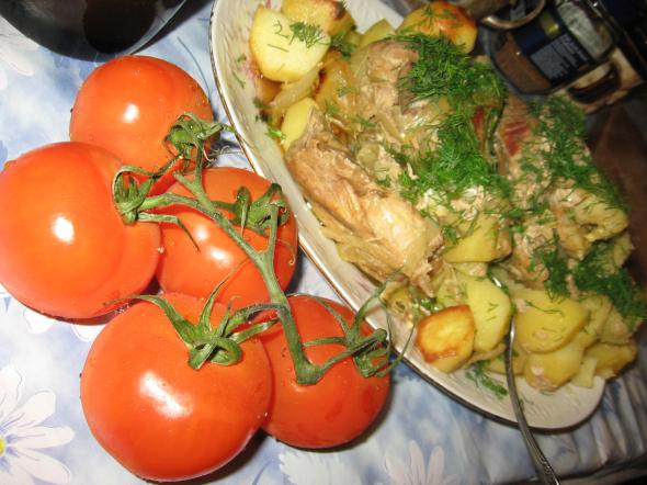 Для этого не понадобится много продуктов:свинина около килограмма, картошечка, лук, специи и никакого масла!