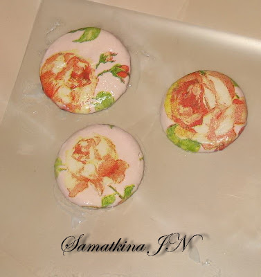 Смазываем нашу фишку клеем, затем заранее подготовленный фрагмент салфетки прикладываем к фишке и аккуратно от центра к краям начинаем промазывать клеем, стараясь максимально ровно распределить салфетку.