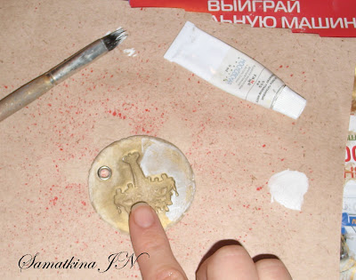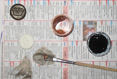 Как сделать саму рельефную фишку я описала выше, а вот как ее покрасить покажу сейчас. Сначала нам надо выделить основной рисунок. Наносим первый слой краски, хорошенько прокрашивая все выемки.Чтобы получить эффект старого золота, я смешала золотую краску с черной.