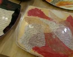 Декорация проводится на обратной стороне прозрачной тарелки путем нанесения различных элементов декорации, вырезанных из специальной бумаги для декупажа, затем наносится фон акриловой краской и все это фиксируется последним слоем лака.