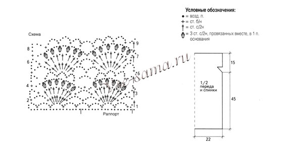Размер: 40-42 Вам потребуется: пряжа (90% акрил, 10% люрекс, 380 м/100 г) - 200 г серого цвета, крючок №2,5. Плотность вязания: 16 п. х 18 рядов = 10x10 см. Спинка: наберите цепочку из 80 возд. п. + 1 п. для симметрии, вяжите по схеме. На высоте 45 см оставьте для пройм с обеих сторон по 14 п. Выполните еще 1 раппорт (высота 50 см). Перед: вяжите аналогично спинке. Сборка: выполните боковые швы. По верхнему краю изделия от плеча спинки к плечу переда провяжите цепочки из 30 возд. п. и далее вяжите узором по схеме (узор переда и спинки должен продолжаться, на плечах - по 2 раппорта). Свяжите 2 раппорта в высоту. Затем нижнюю часть рукава обвяжите по схеме 2 раппортами в ширину и 1 раппортом в высоту. Затем обвяжите всю пройму по кругу 4 раппортами в ширину и 1 раппортом в высоту. Вторую пройму обвяжите аналогично. Нижний край изделия и проймы и вырез горловины обвяжите 1 рядом ст. с/н. В качестве пояска свяжите цепочку из 240 возд. п., провяжите 2 ряда ст. с/н. Проденьте поясок в первый ряд седьмого раппорта.
