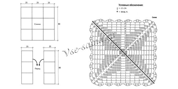 Жилет из квадратных мотивов Размер: XXXL Вам потребуется: пряжа (70% хлопок, 30% лен, 550 м/100 г) - 300 г меланжевого цвета, крючок №3. Плотность вязания: 1 квадратный мотив = 25x25 см. Свяжите 15 квадратов по схеме. Соедините их между собой в соответствии с выкройками пятью возд. петлями в процессе вязания. Спереди свяжите 2 завязки из 90 возд. п. |