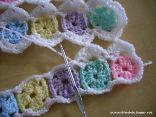 Faixa 3 unir a faixa 4 com 20 correntinhas crochê, 1 pto baixo, 20 correntinhas
