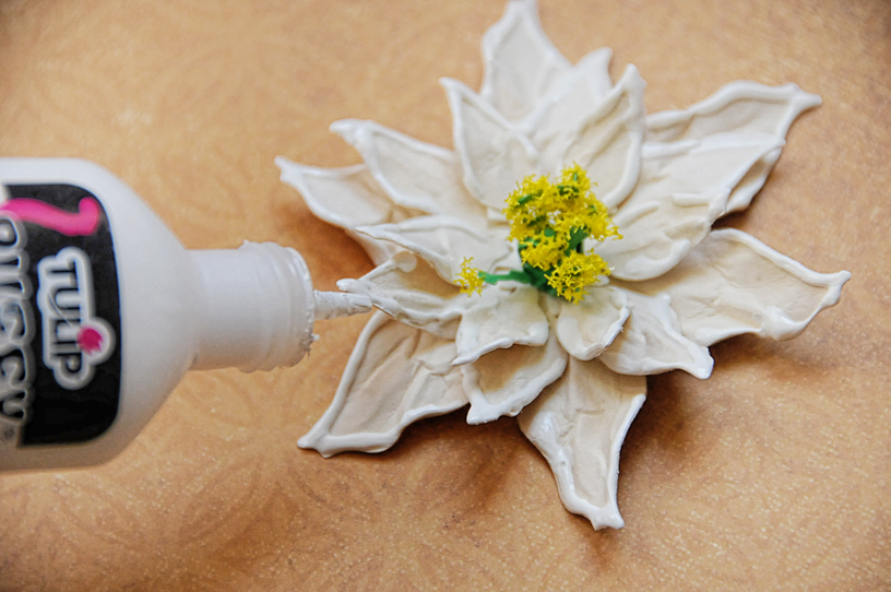 You can stop at the last step, or you can give your poinsettia a snowy look by edging the petals with puffy paint. Let sit until dry.