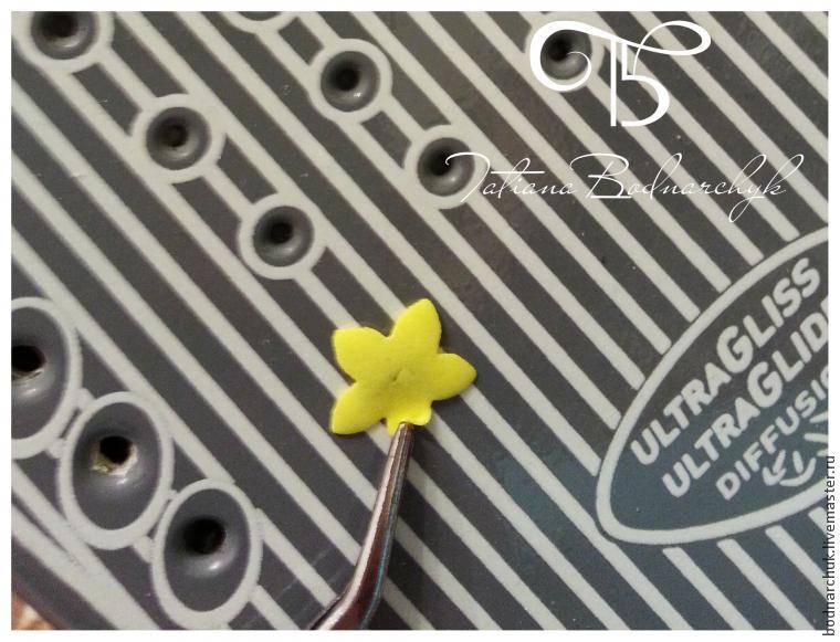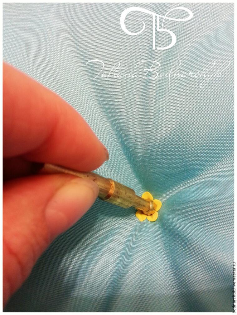 10. Наносим каплю клея под головку тычинки и быстро надеваем цветочек, пока клей не застыл.