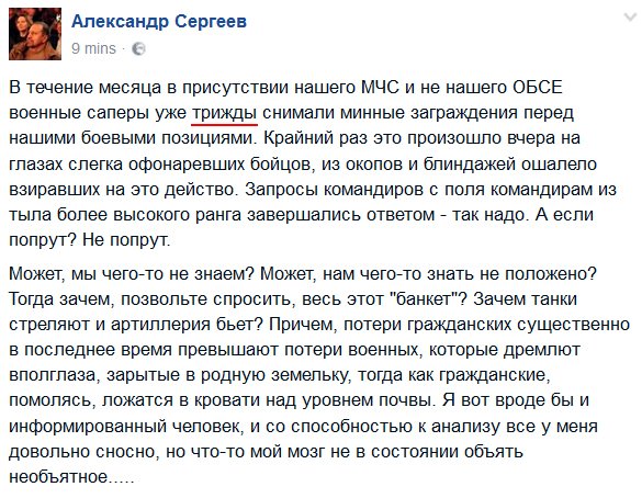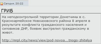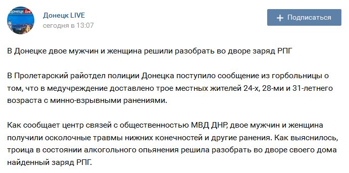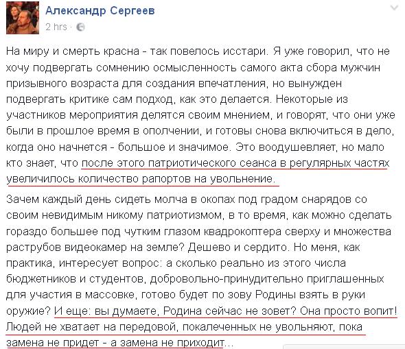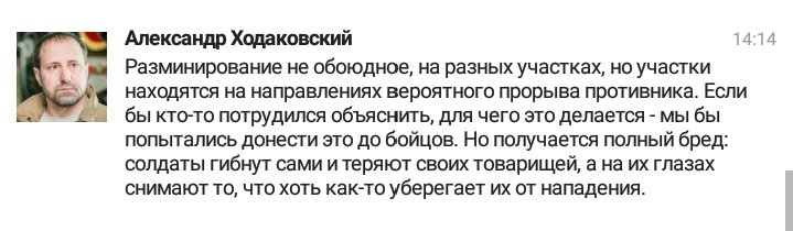 Я немного поясню, чтобы было лучше понятно. Тот конченый, который дал добро на это шоу - видимо за три года не второпал, што у нас тут, ..., гражданская война, и проводить во время гражданской войны в век информационных технологий мобилизационный сбор, являющийся мероприятием сугубо мирного времени - это, ..., не только долб..., но и преступление. Впрочем, подозреваю, что мероприятие разрабатывало министерство обороны во главе с боевым ...гномом всея Донецкой нарядной республики Кононовым. Про того, кто утверждал проведение сверху - мы стыдливо умолчим, скажу только, что его хвамилиё начинается на букву "Зы". Эх, прощай окончательно мои старлейские звёздочки, чо уж теперь.