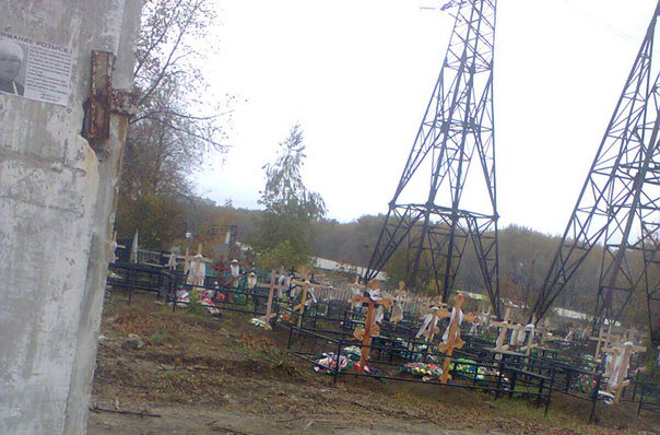 ДНР. Кладбище на шахте 19. Слева висит ориентировка на пропавшего.