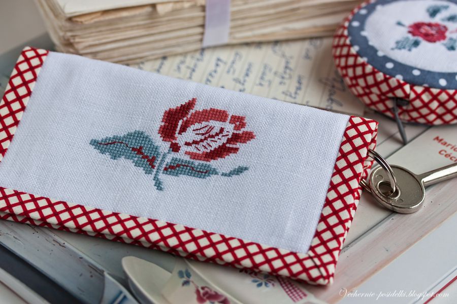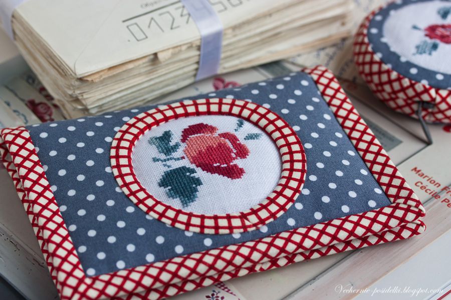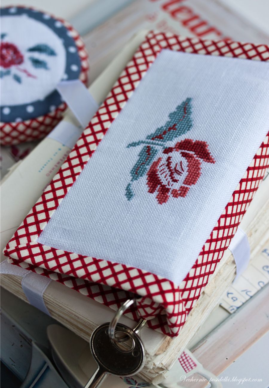 Мысли об оформлении трёх вышитых красно-серых цветков (вы, конечно, узнали эти цветы из книги «Fleurs de Digoin» были у меня именно такие – оформить их так, как я вышивку еще не оформляла. Как ни странно, такая неромантичная и непрактичная идея может, в итоге, привести к появлению очень даже полезных и симпатичных вещей, на которые смотришь и удивляешься: и как я раньше без них обходилась?