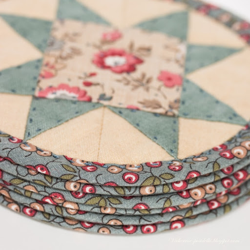 У меня была очень хорошая задумка — приделать этим шести лоскутным «блинчикам» шёлковые петельки и подвесить на ёлку... Но после того как первый «блин» был полностью собран, стало понятно, что не видать им ёлки, как своих ушей — великоваты... Переделывать не возникло никакого желания, и к тому же я себя уговорила решила, что другое применение подойдет им гораздо больше — из «блинчиков» выйдут отличные салфетки под чашки-стаканы... Вот такая очередная история о том, как первоначальная задумка и результат бывают далеки друг на друга. И, кстати, я оказалась права, в роли подстаканников они смотрятся прекрасно! Уже обновила.