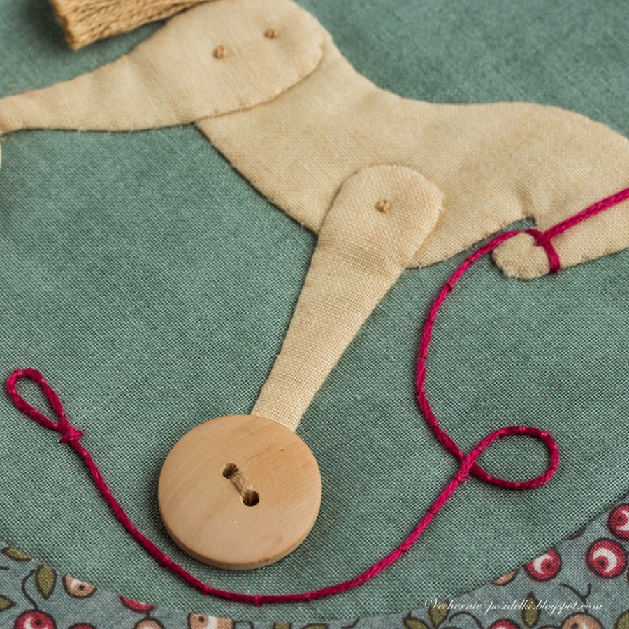 Детали лошадки продублированы клеевым объёмным флизелином. Края подвернуты и пришиты маленькими стежками. Верёвочка — коучинг: