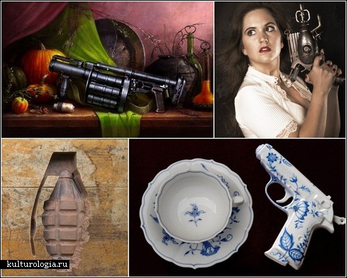 Художники из креативной студии Geliografic создают прекрасные натюрморты. Их можно было бы назвать классическими, если бы не одно НО: помимо живописно разложенных фруктов и овощей, бокалов и бутылок, ваз с цветами и кувшинов с молоком обязательной частью каждой композиции выступают различные виды огнестрельного оружия.