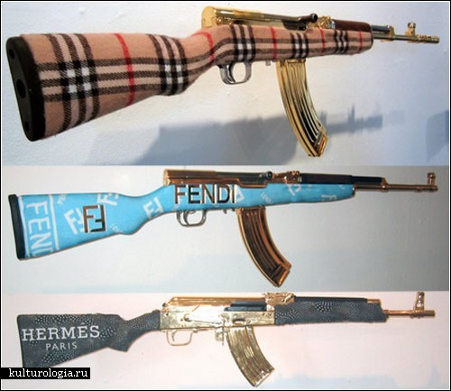 Дизайнер Peter Gronquist создал коллекцию оружия, украшенного брендами модных домов Hermes, Prada, Gucci, Burberry, Coach, Paul Smith, Dior, Fendi, Chanel, Versace, Fendi and D&G. Что ж, мода – это тоже своего рода оружие, причем оружие массового поражения.
