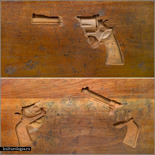 Бен Тернбулл считает, что истоки жестокости в мире кроются в том, что с насилием дети знакомятся уже со школьной скамьи: в этом им «помогают» компьютерные игры-стрелялки и американские боевики. Протестуя против такого положения дел, автор выражает на старых школьных партах изображения оружия.