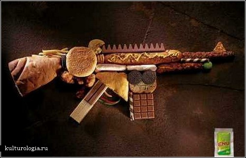 Креативщики из индийского рекламного агентства Ogilvy & Mather соорудили автомат, собранный из булочек, плиток шоколада, батончиков и прочей «быстрой» еды. Таким образом авторы решили прорекламировать дезинфицирующее средство для рук.