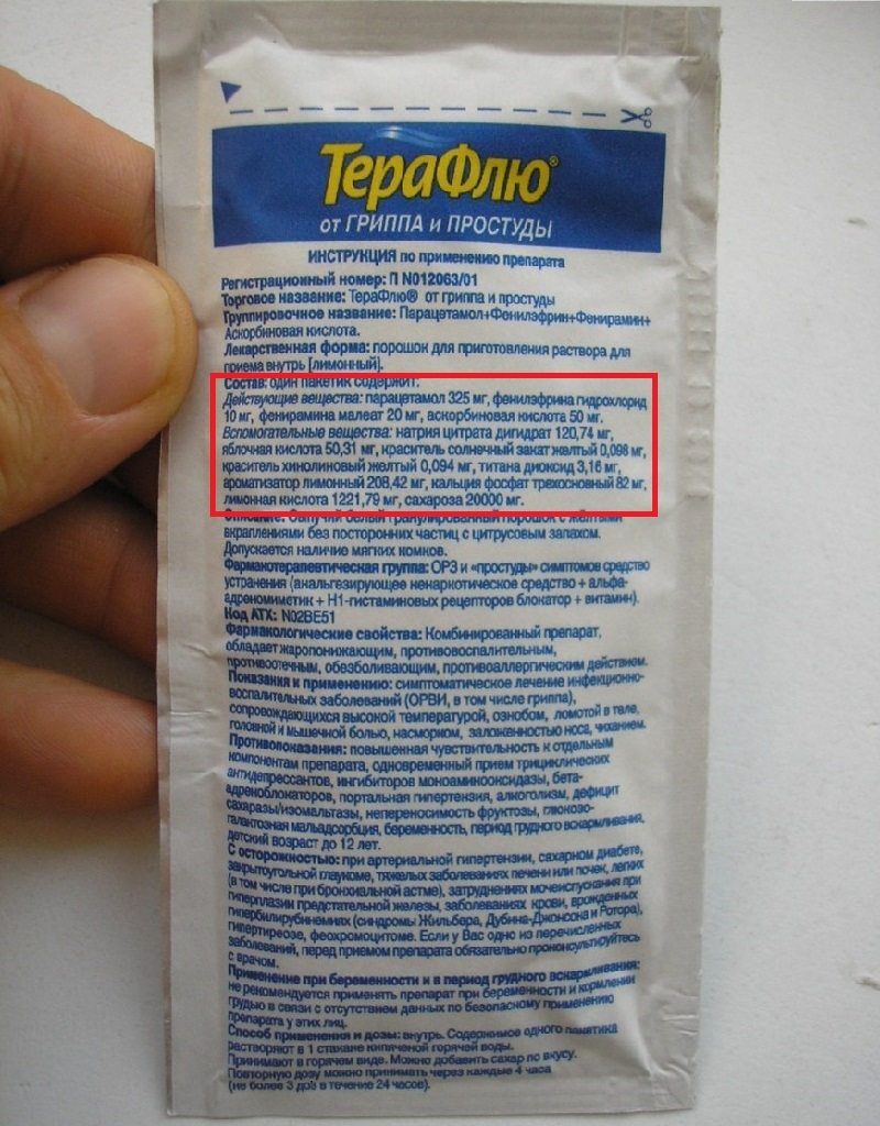«Терафлю», «Фервекс», «Колдрекс» — всё это комбинированные препараты на основе парацетамола с добавлением сосудосуживающих веществ, искусственных подсластителей и аскорбиновой кислоты.