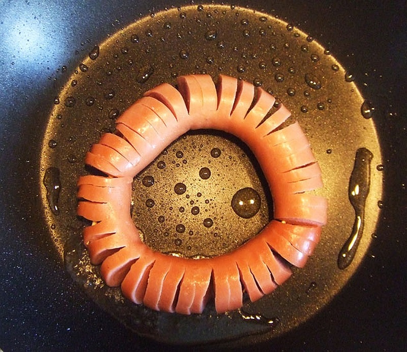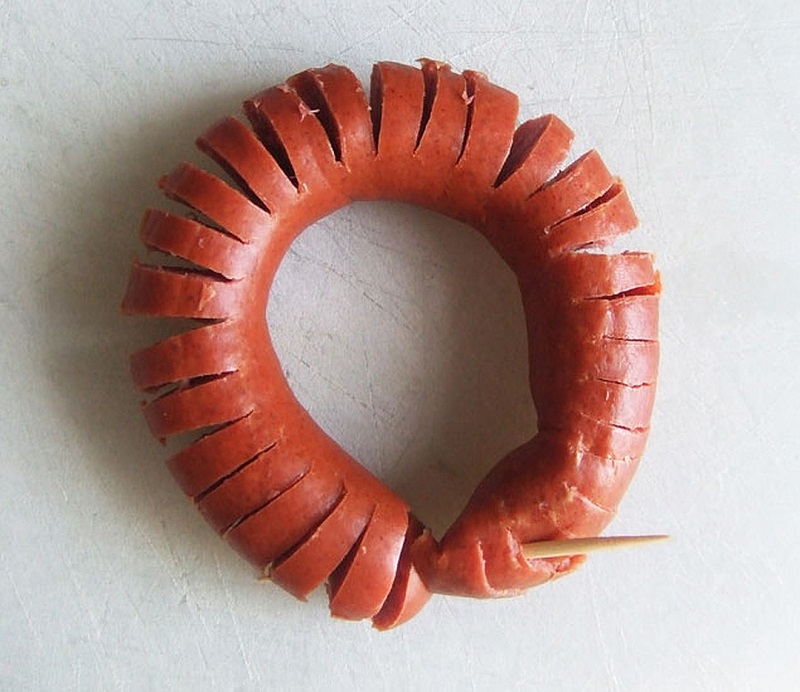 Согни сосиску в кольцо и скрепи ее концы при помощи зубочистки.