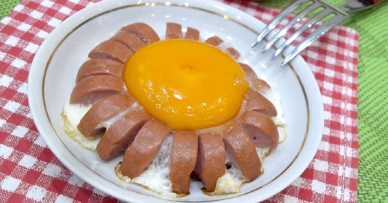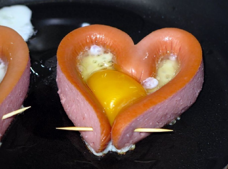 Еще можешь сделать вот такие сосисочные сердца. Для этого тебе нужно надрезать сосиску вдоль (не до конца!) и сформировать «сердце», закрепив кончики зубочисткой. И, как в предыдущих вариантах, — вбиваешь яйцо и жаришь.