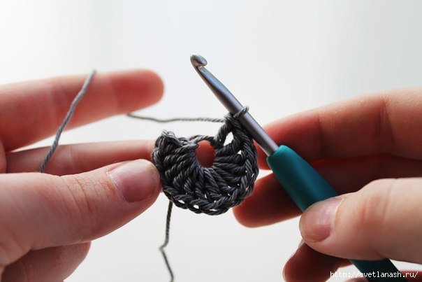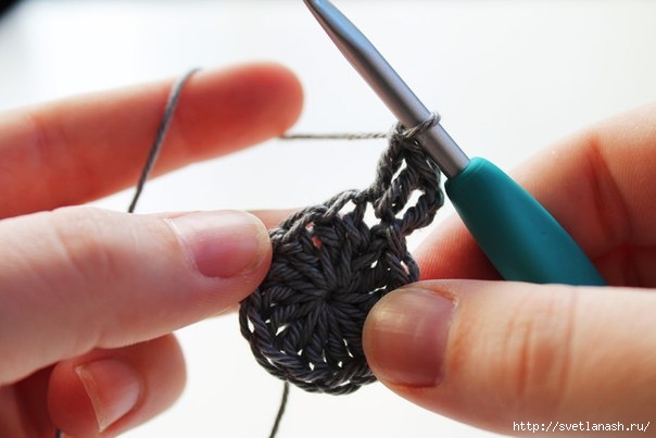 В результате на крючке остается 1 петля, а мы получаем витой столбик. Особенностью первого ряда является то, что основание все 5 витых столбиков крепятся в одну и ту же петлю предыдущего ряда. Перед созданием 2-го столбика заводим крючок в петлю предыдущего ряда и протягиваем через него нить, не стягивая. Сразу переходим к созданию очередного столбика.