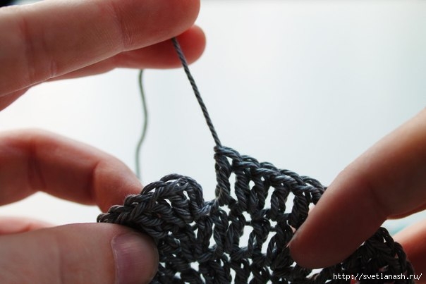 Провязываем столбик с накидом и закрепляем его в петлю между объемными фрагментами. Снова делаем 3 воздушных петли. Так продолжаем обвязку до конца ряда.