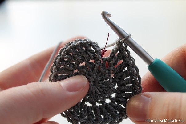 Когда все 5 столбиков готовы, верхушку последнего крепим в 4 петлю нижнего ряда и начинаем вязать следующий фрагмент.
